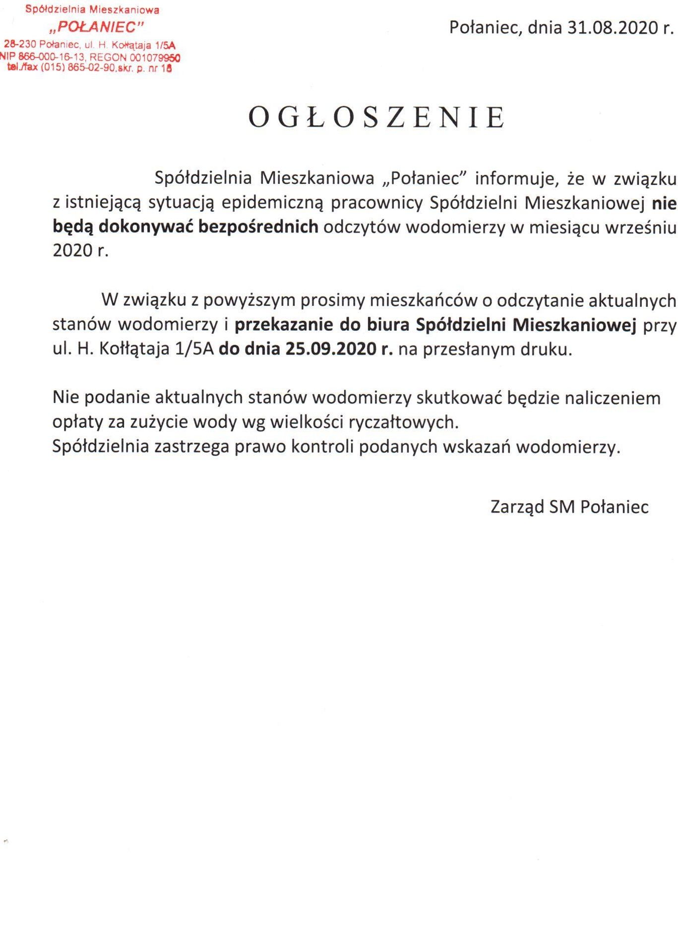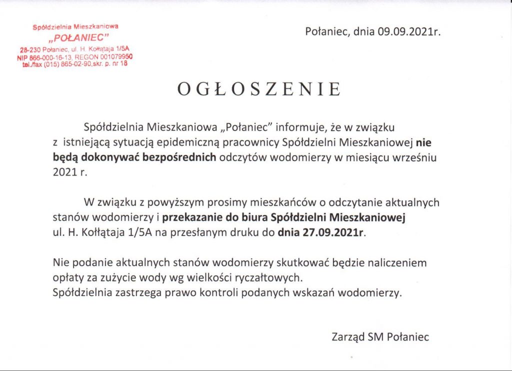Spółdzielnia Mieszkaniowa „Połaniec” przypomina o mijającym terminie na podanie stanów wodomierzy upływającym w dniu 24 września 2025 r.