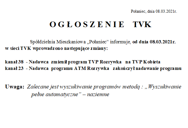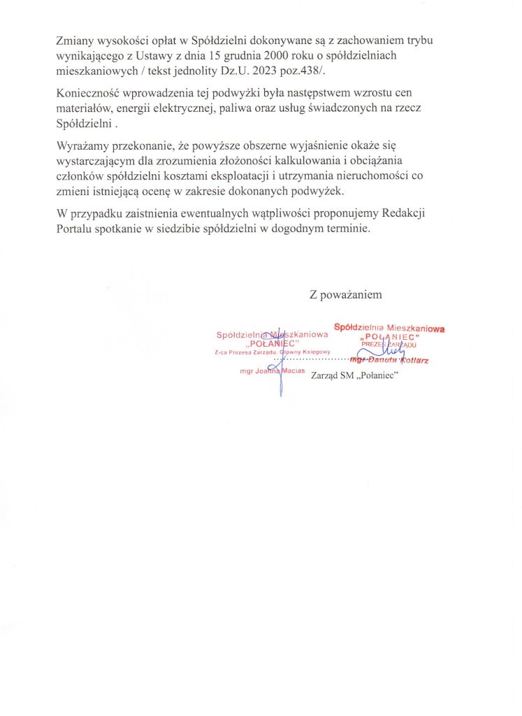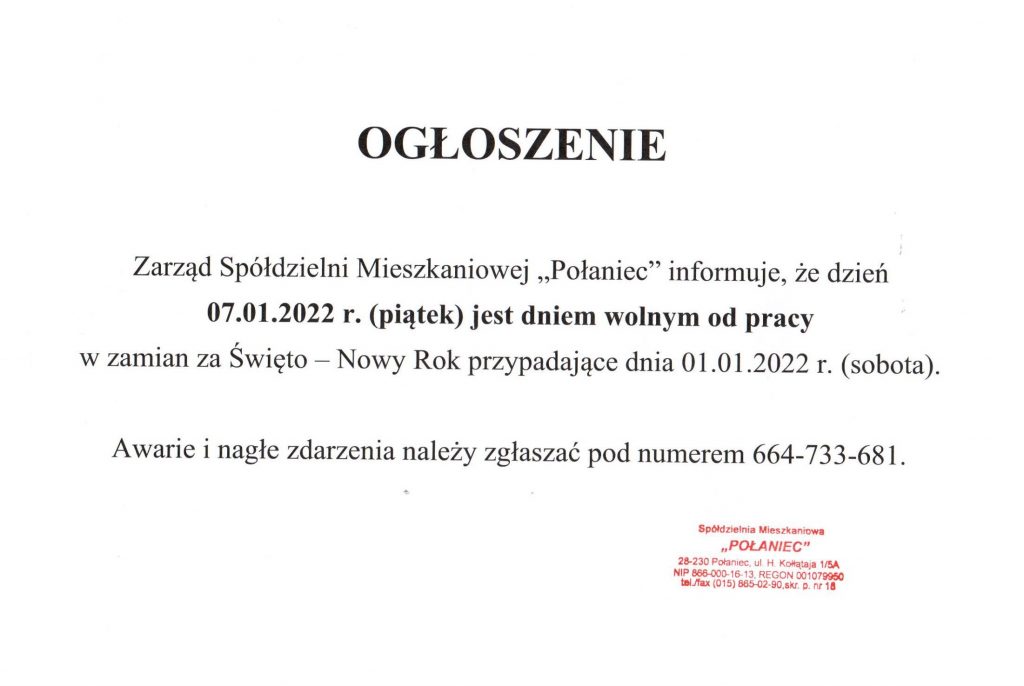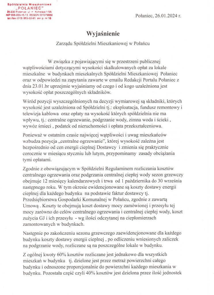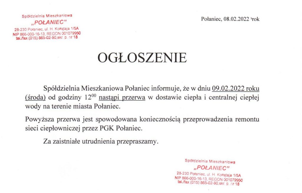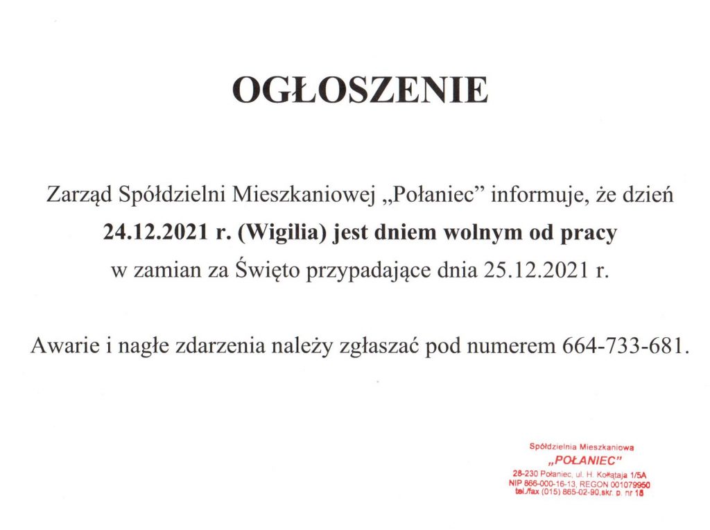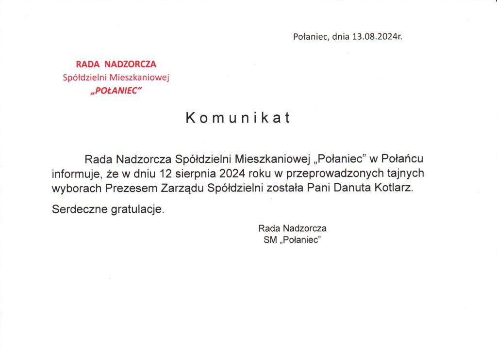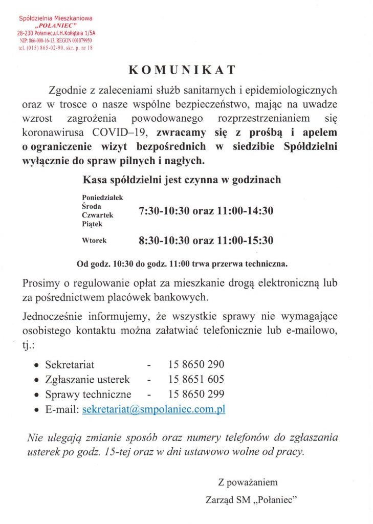 Spółdzielnia Mieszkaniowa „Połaniec” informuje, że od dnia 19.04.2022r.